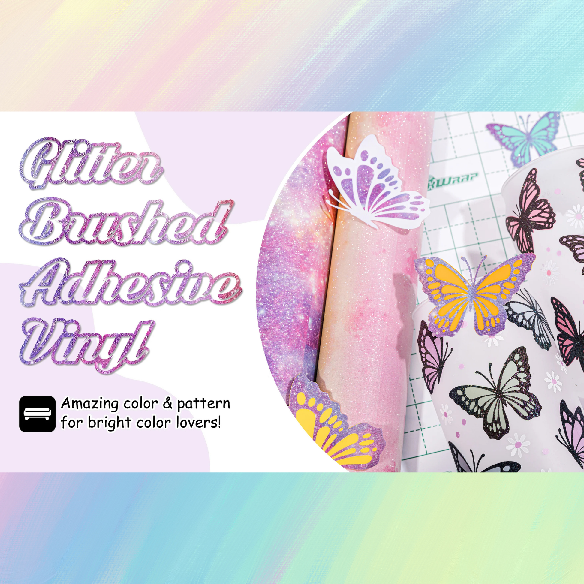 Gökkuşağı tonlarında, simli, dokulu premium bir vinildir. Özel Projeleriniz için idealdir.